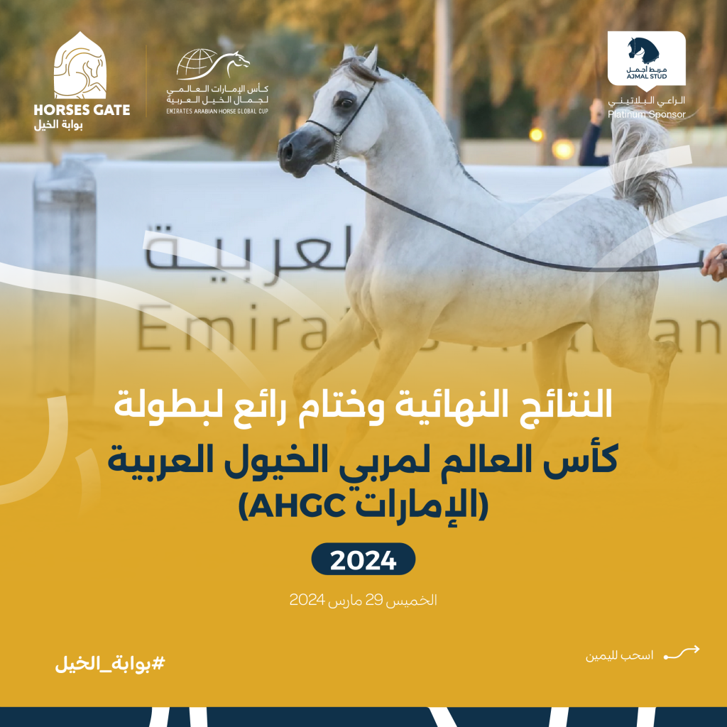 ها نحن في اليوم الأخير حيث تسير البطولة نحو ختامها في غمرة من الحماس والتشويق، نستقبل اليوم الختامي المُثير لأحد أبرز الأحداث الرياضية العالمية في عالم جمال الخيل العربية الأصيلة، لبطولة كأس العالم لمربي الخيول العربية (الإمارات AHGC)برعاية سمو الشيخ منصور بن زايد آل نهيان، نائب رئيس الدولة، نائب رئيس مجلس الوزراء، رئيس ديوان الرئاسة، رئيس مجلس إدارة جمعية الإمارات للخيول العربية.